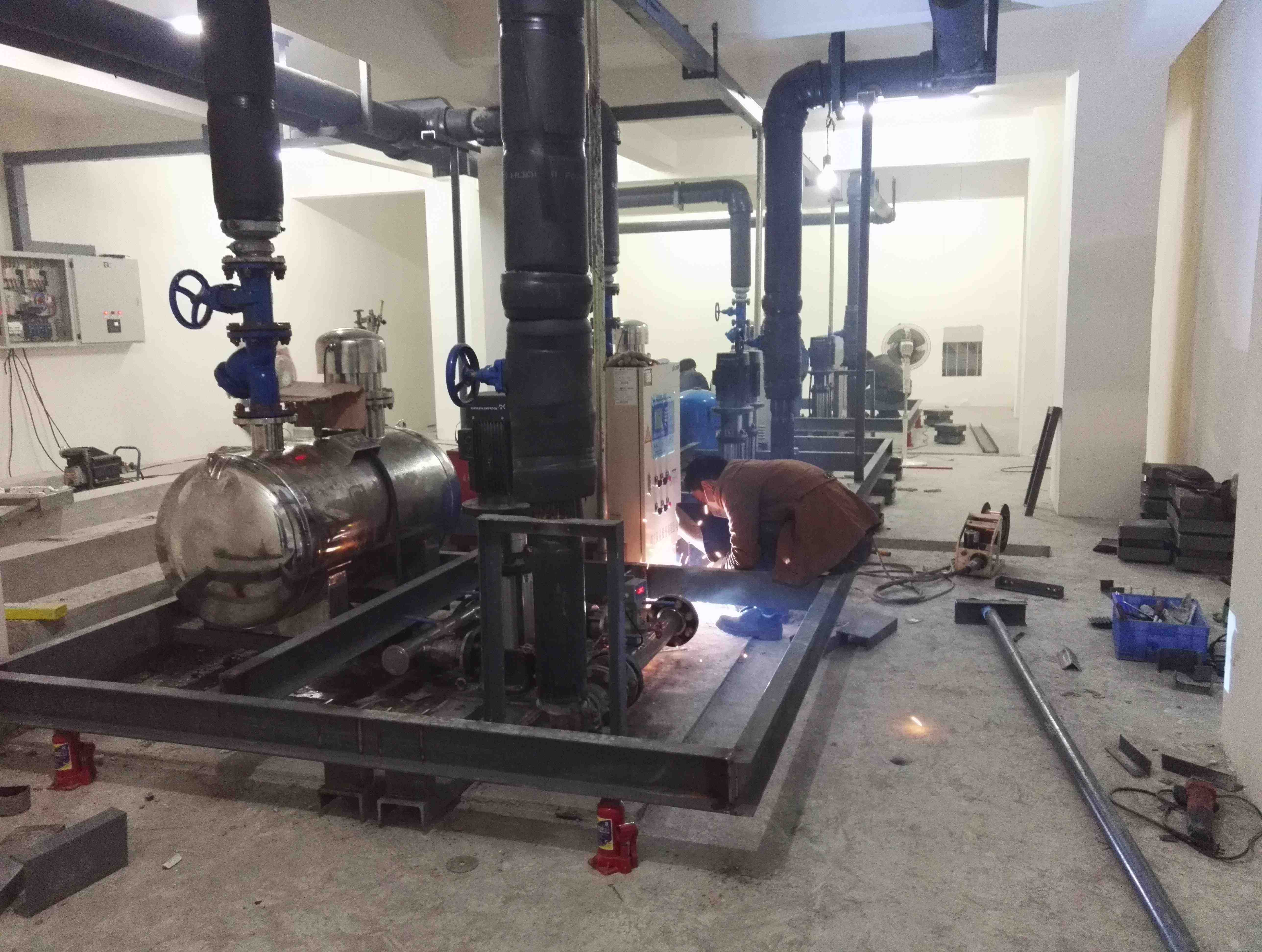 噪聲產(chǎn)生原因:我們認(rèn)為水泵基礎(chǔ)沒(méi)有進(jìn)行精確減振、管道沒(méi)有進(jìn)行軟連接和減振處理,水泵機(jī)組的低頻振動(dòng)沿著樓板、柱頭、墻壁向樓上傳播,導(dǎo)致樓上樓業(yè)主房間墻壁、地板、天花板、柱頭振動(dòng)明顯,房間內(nèi)低頻噪聲嗡鳴聲非常嚴(yán)重,雖然A聲級(jí)測(cè)量為39分貝,好像超標(biāo)不是太多(標(biāo)準(zhǔn)為35分貝),此類噪聲頻率低,分貝數(shù)不高,但對(duì)人體影響較大,由于噪聲的頻率集中在150-500赫茲,對(duì)人體大腦產(chǎn)生大量的@電波,引起人體煩惱度增大。水壓管道水流聲共振、水箱進(jìn)水脈沖等噪聲是影響樓上業(yè)主家里聲環(huán)境的主要因素,為此我們確定我們的施工方案與降噪目標(biāo)。